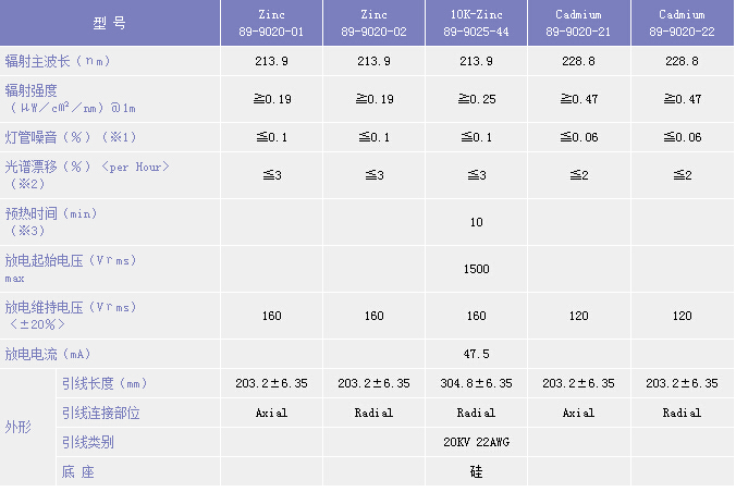 ※1 最大輻射波長為0.1sec條件下的數據。 ※2 自啟動1小時后的穩定溫度條件下的相關數據。 ※3 達到峰值輻射所需時間。 warranty:使用一年或1000小時后的最小輻射強度在初始值50%以上。 10K-Zinc燈則定義為使用18個月或者2500小時后的最小輻射強度在初始值50%以上。 (上述數值均為使用BHK專用電源或BHK推薦電源條件下的參考值) |