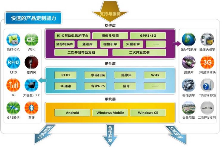 軟件定制:HI-Q移動(dòng)GIS軟件平臺(tái),攝像頭引擎,坐標(biāo)轉(zhuǎn)換庫(kù),通訊庫(kù),柵格引擎,矢量引擎,二次開發(fā)幫助文檔,二次開發(fā)實(shí)例等;